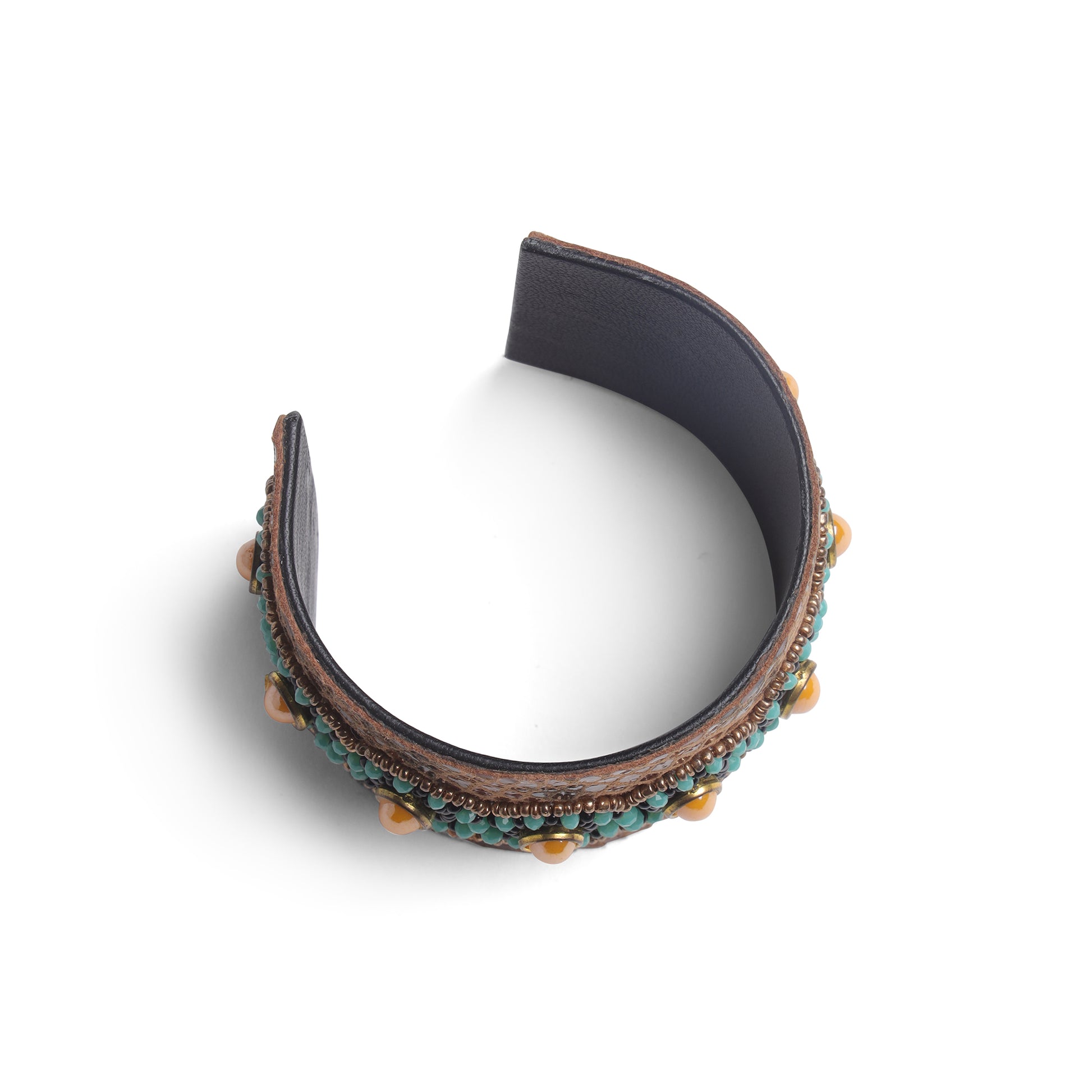 Make a bold yet elegant statement with the Amica Slexia Turquoise & Amber Stone Embellished Textured Cuff Bangle. Designed on a rich textured base, this wide cuff bangle features striking amber-toned stones beautifully surrounded by turquoise bead detailing, creating a vibrant and luxurious look.