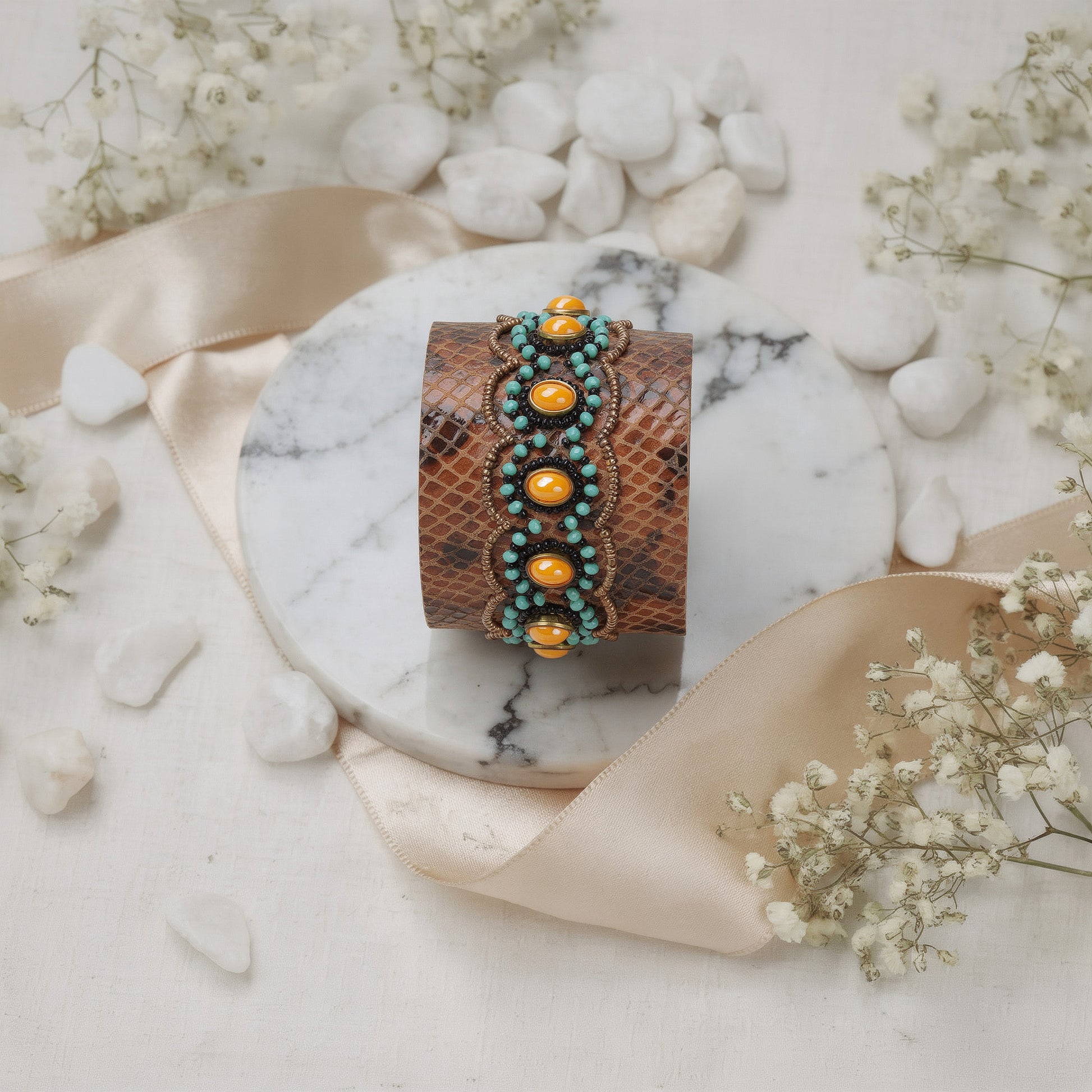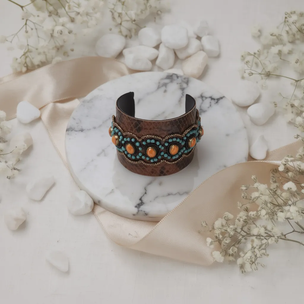 Turquoise & Amber Stone Embellished Textured Cuff Bangle for Women