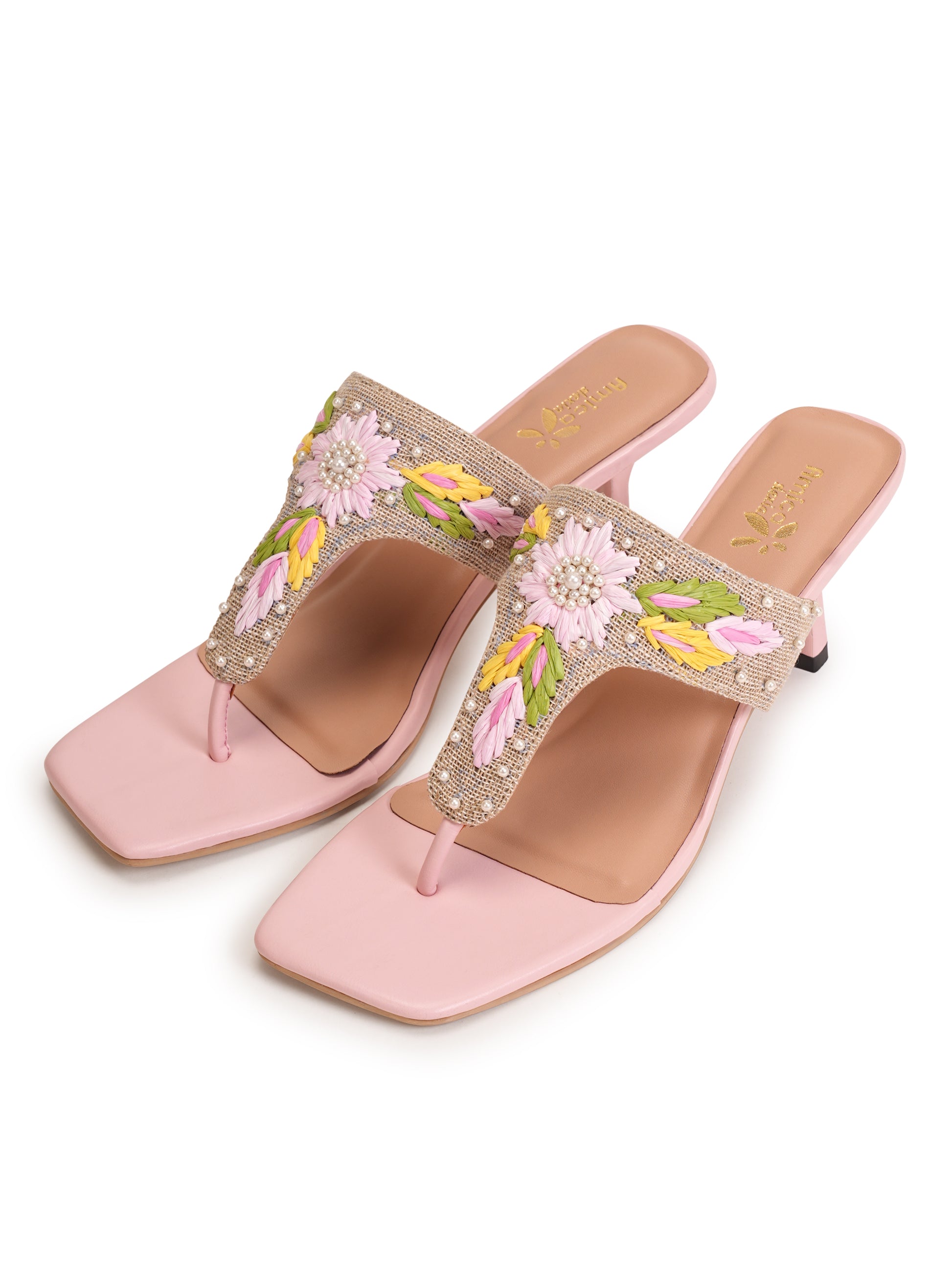 Step into elegance with Amica Slexia’s Pink Embroidered Heeled Slip-Ons, crafted to add a festive charm to every outfit. These stunning sandals feature hand-embroidered floral detailing with pearl accents, a modern square toe, and a comfortable low heel for graceful comfort. Perfect for weddings, parties, and ethnic celebrations, they blend traditional artistry with modern sophistication. 🌸✨