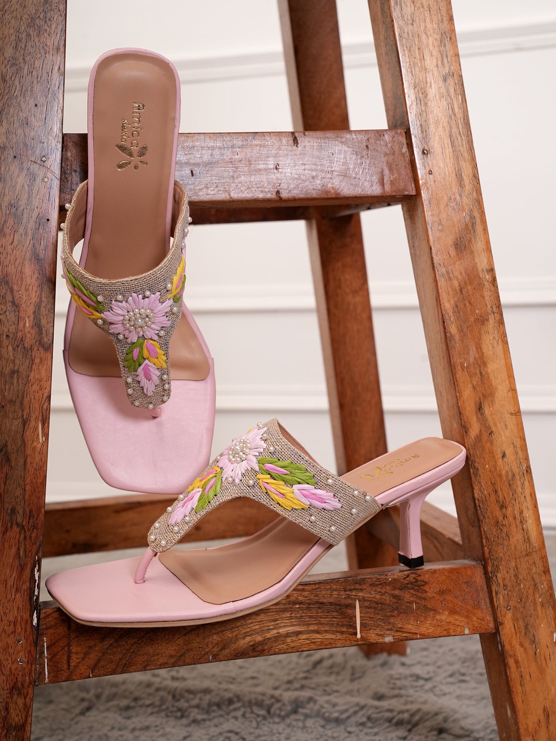 Women’s Pink Embroidered Ethnic Heeled Slip-On Sandals