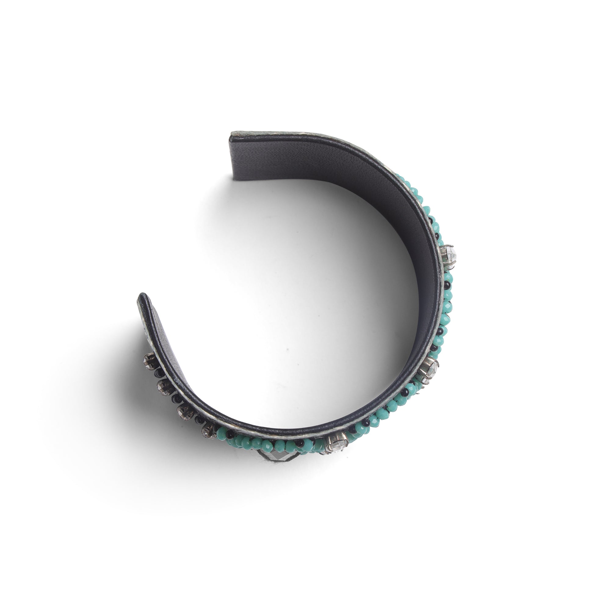 Add a touch of contemporary elegance to your look with the Amica Slexia Handcrafted Grey Textured Cuff Bangle. Designed on a rich grey, snake-textured base, this wide cuff features circular stone motifs framed with turquoise beads, beautifully highlighted by crystal accents for a refined sparkle.